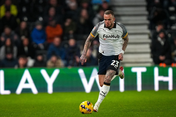 Joe Ward of Derby County runs with the ball during the Sky Bet Championship match Derby County vs Millwall at Pride Park Stadium, Derby, United Kingdom, 10th December 2025, Credit:Maynard Manyowa/News Images / Avalon