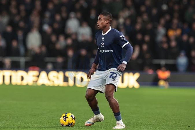 Aidomo Emakhu of Millwall with the ball during the Sky Bet Championship match Derby County vs Millwall at Pride Park Stadium, Derby, United Kingdom, 10th December 2025, Credit:Mark Cosgrove/News Images / Avalon
