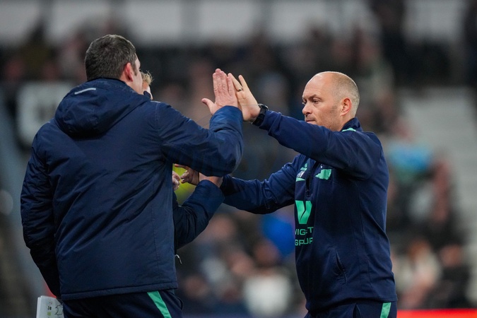 Alex Neil manager of Millwall celebrates with his technical team after his team scored to make it 0-1 during the Sky Bet Championship match Derby County vs Millwall at Pride Park Stadium, Derby, United Kingdom, 10th December 2025, Credit:Maynard Manyowa/News Images / Avalon