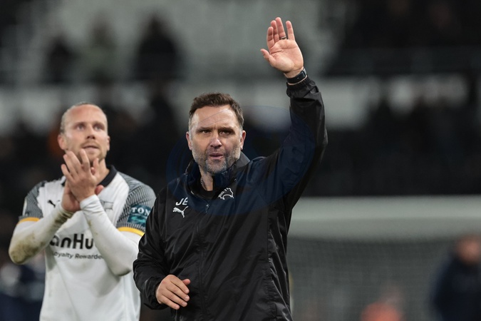 John Eustace manager of Derby County waves to the fans during the Sky Bet Championship match Derby County vs Millwall at Pride Park Stadium, Derby, United Kingdom, 10th December 2025, Credit:Mark Cosgrove/News Images / Avalon