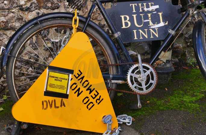 The long standing advertising bicycle for The Bull Inn in Sonning on Thames has been ‘prank clamped' by suspected local artist Impro. The bike has a police aware sign, DVLA clamp and parking ticket attacked it it."Impro" is the alias for an anonymous, mischievous installation artist known for placing quirky, often satirical objects like fake post boxes, telephones, and even a cash machine on Sonning Bridge in Berkshire, England. His work, which includes protests against Thames Water and commentary on modern life, brings attention to absurdities, turning public spaces into whimsical art installations that generate local buzz., Credit:Geoffrey Swaine / Avalon