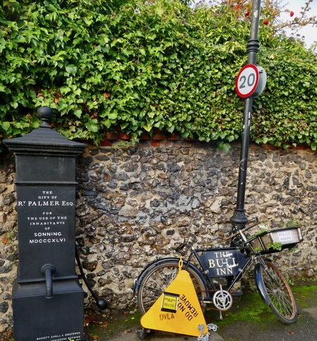 The long standing advertising bicycle for The Bull Inn in Sonning on Thames has been ‘prank clamped' by suspected local artist Impro. The bike has a police aware sign, DVLA clamp and parking ticket attacked it it."Impro" is the alias for an anonymous, mischievous installation artist known for placing quirky, often satirical objects like fake post boxes, telephones, and even a cash machine on Sonning Bridge in Berkshire, England. His work, which includes protests against Thames Water and commentary on modern life, brings attention to absurdities, turning public spaces into whimsical art installations that generate local buzz., Credit:Geoffrey Swaine / Avalon