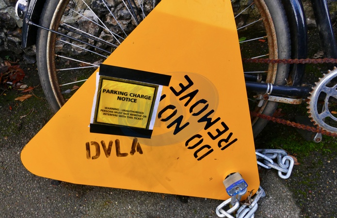 The long standing advertising bicycle for The Bull Inn in Sonning on Thames has been ‘prank clamped' by suspected local artist Impro. The bike has a police aware sign, DVLA clamp and parking ticket attacked it it."Impro" is the alias for an anonymous, mischievous installation artist known for placing quirky, often satirical objects like fake post boxes, telephones, and even a cash machine on Sonning Bridge in Berkshire, England. His work, which includes protests against Thames Water and commentary on modern life, brings attention to absurdities, turning public spaces into whimsical art installations that generate local buzz., Credit:Geoffrey Swaine / Avalon