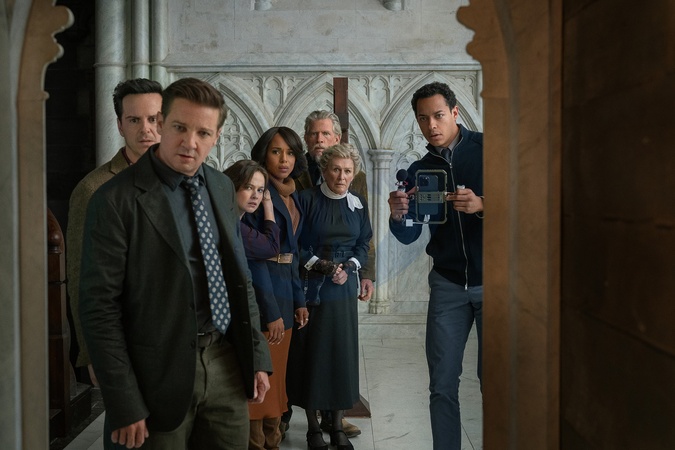 Andrew Scott, Daryl McCormack, Glenn Close, Cailee Spaeny, Kerry Washington, Thomas Haden Church, Jeremy Renner, "Wake Up Dead Man: A Knives Out Mystery" (2025), Credit:John Wilson/Netflix / Avalon