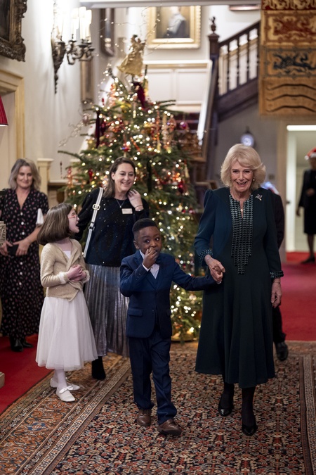 Queen Camilla holds hands with Samuel during the Christmas tree decorating event supported by Helen and Douglas House and Roald Dahl's, Marvellous Children's Charity, at Clarence House in London. Picture date: Thursday December 11, 2025., Credit:Aaron Chown / Avalon