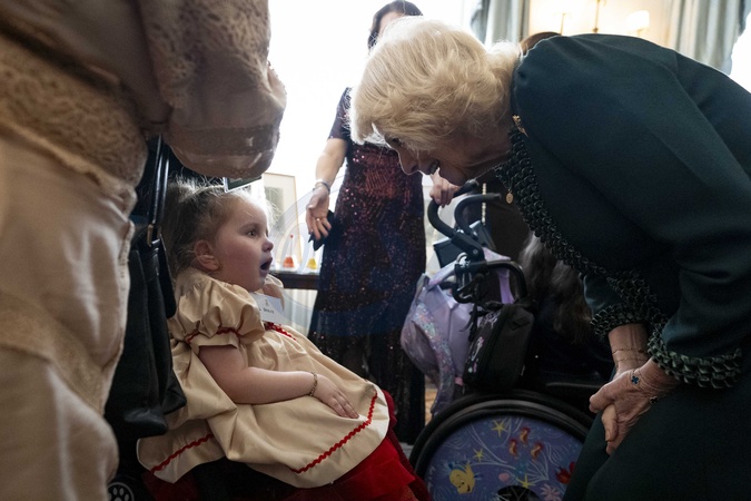 Queen Camilla speaks with Dolce during the Christmas tree decorating event supported by Helen and Douglas House and Roald Dahl's, Marvellous Children's Charity, at Clarence House in London. Picture date: Thursday December 11, 2025., Credit:Aaron Chown / Avalon