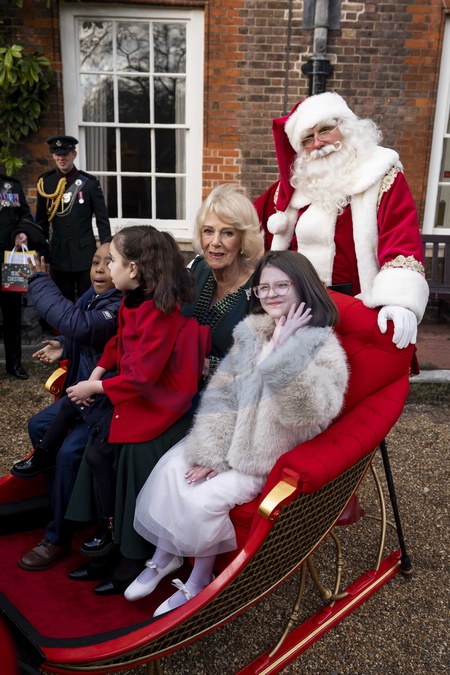 A person dressed as Father Christmas, Queen Camilla and Myla (right) on the State Sleigh in the gardens of Clarence House, London, during the Christmas tree decorating event supported by Helen and Douglas House and Roald Dahl's, Marvellous Children's Charity. Picture date: Thursday December 11, 2025., Credit:Aaron Chown / Avalon