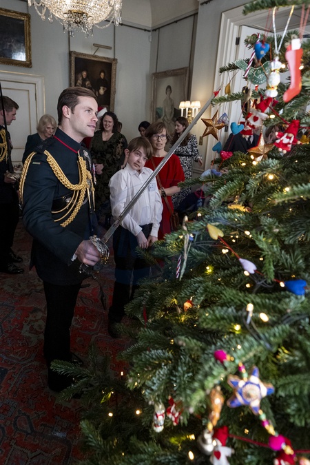 Major Ollie Plunket helps Ivan decorate the Christmas tree using his sword during an event supported by Helen and Douglas House and Roald Dahl's, Marvellous Children's Charity, at Clarence House in London. Picture date: Thursday December 11, 2025., Credit:Aaron Chown / Avalon