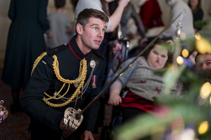 Major Rob Treasure helps decorate the Christmas tree using his sword during an event supported by Helen and Douglas House and Roald Dahl's, Marvellous Children's Charity, at Clarence House in London. Picture date: Thursday December 11, 2025., Credit:Aaron Chown / Avalon