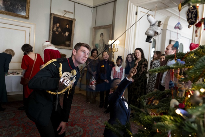 Major Rob Treasure helps Samuel decorate the Christmas tree using his sword during an event supported by Helen and Douglas House and Roald Dahl's, Marvellous Children's Charity, at Clarence House in London. Picture date: Thursday December 11, 2025., Credit:Aaron Chown / Avalon