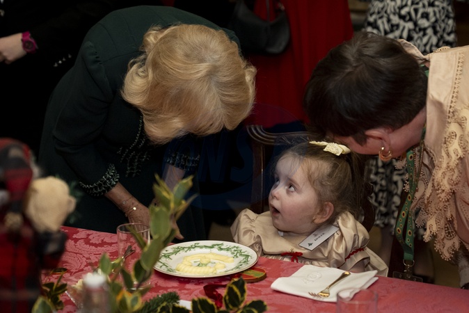 Queen Camilla serves food to Dolce at the Christmas tree decorating event, supported by Helen and Douglas House and Roald Dahl's, Marvellous Children's Charity, at Clarence House, London. Picture date: Thursday December 11, 2025., Credit:Aaron Chown / Avalon