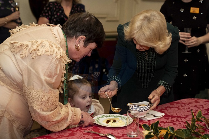 Queen Camilla serves food to Dolce at the Christmas tree decorating event, supported by Helen and Douglas House and Roald Dahl's, Marvellous Children's Charity, at Clarence House, London. Picture date: Thursday December 11, 2025., Credit:Aaron Chown / Avalon