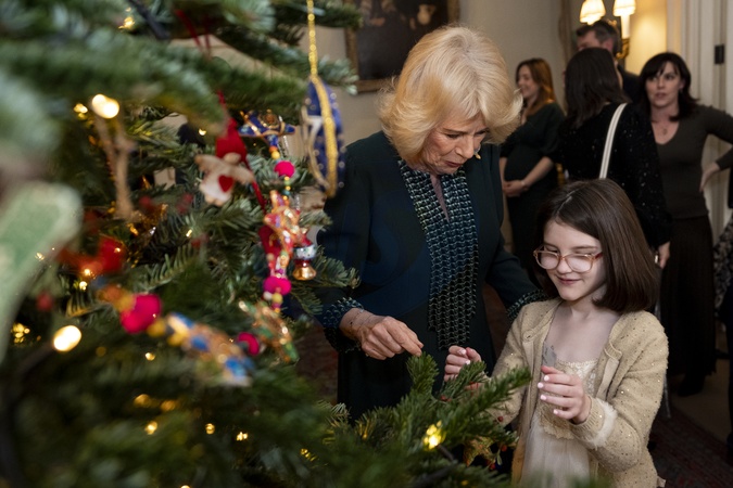 Queen Camilla and Myla place a decoration on the Christmas tree at Clarence House, London, in an event supported by Helen and Douglas House and Roald Dahl's, Marvellous Children's Charity. Picture date: Thursday December 11, 2025., Credit:Aaron Chown / Avalon
