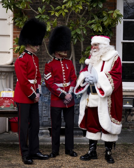 A person dressed as Father Christmas meets members of the Coldstream Guards in the gardens of Clarence House, London, during the Christmas tree decorating event supported by Helen and Douglas House and Roald Dahl's, Marvellous Children's Charity. Picture date: Thursday December 11, 2025., Credit:Aaron Chown / Avalon