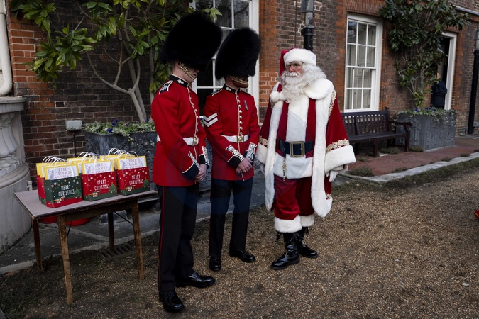 A person dressed as Father Christmas meets members of the Coldstream Guards in the gardens of Clarence House, London, during the Christmas tree decorating event supported by Helen and Douglas House and Roald Dahl's, Marvellous Children's Charity. Picture date: Thursday December 11, 2025., Credit:Aaron Chown / Avalon