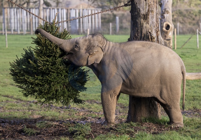 Asian elephant calf Nang Phaya eats treats hidden in a Christmas tree at Whipsnade Zoo Picture date: Thursday December 11, 2025., Credit:Anthony Devlin / Avalon