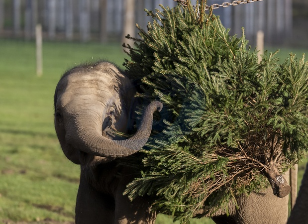 Asian elephant calf Nang Phaya eats treats hidden in a Christmas tree at Whipsnade Zoo Picture date: Thursday December 11, 2025., Credit:Anthony Devlin / Avalon