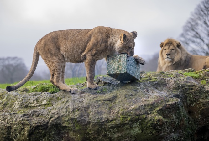 A North African lion cub unwraps a gift at Whipsnade Zoo. Picture date: Thursday December 11, 2025., Credit:Anthony Devlin / Avalon