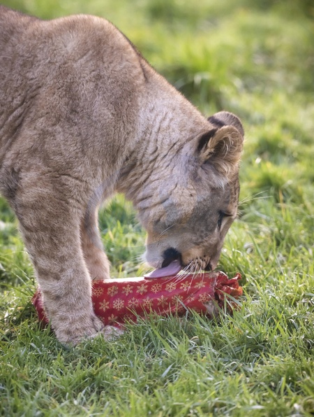 A North African lion cub licks a Pheasant oil scented Christmas cracker at Whipsnade Zoo. Picture date: Thursday December 11, 2025., Credit:Anthony Devlin / Avalon