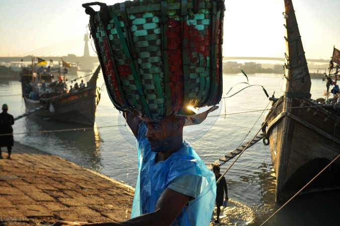 Chattogram, Bangladesh — At winter's first light, labourers in blue plastic aprons unload fresh catch from trawlers at Fisharighat, a key maritime hub, powering Bangladesh's fishing industry, climate-vulnerable coast, marine economy, food security sector, global seafood supply chain, aquaculture growth, and shrimp-export market., Credit:Md Rafayat Haque Khan / Avalon