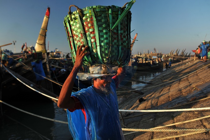 Chattogram, Bangladesh — At winter's first light, labourers in blue plastic aprons unload fresh catch from trawlers at Fisharighat, a key maritime hub, powering Bangladesh's fishing industry, climate-vulnerable coast, marine economy, food security sector, global seafood supply chain, aquaculture growth, and shrimp-export market., Credit:Md Rafayat Haque Khan / Avalon