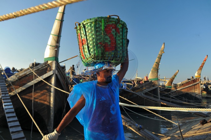 Chattogram, Bangladesh — At winter's first light, labourers in blue plastic aprons unload fresh catch from trawlers at Fisharighat, a key maritime hub, powering Bangladesh's fishing industry, climate-vulnerable coast, marine economy, food security sector, global seafood supply chain, aquaculture growth, and shrimp-export market., Credit:Md Rafayat Haque Khan / Avalon