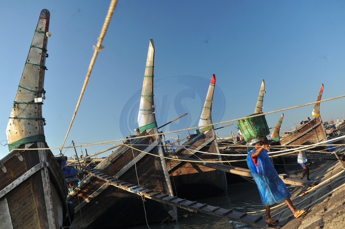 Chattogram, Bangladesh — At winter's first light, labourers in blue plastic aprons unload fresh catch from trawlers at Fisharighat, a key maritime hub, powering Bangladesh's fishing industry, climate-vulnerable coast, marine economy, food security sector, global seafood supply chain, aquaculture growth, and shrimp-export market., Credit:Md Rafayat Haque Khan / Avalon