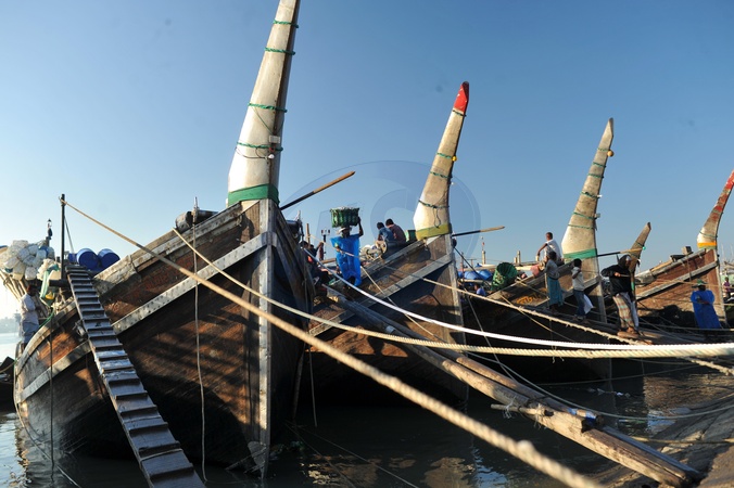 Chattogram, Bangladesh — At winter's first light, labourers in blue plastic aprons unload fresh catch from trawlers at Fisharighat, a key maritime hub, powering Bangladesh's fishing industry, climate-vulnerable coast, marine economy, food security sector, global seafood supply chain, aquaculture growth, and shrimp-export market., Credit:Md Rafayat Haque Khan / Avalon