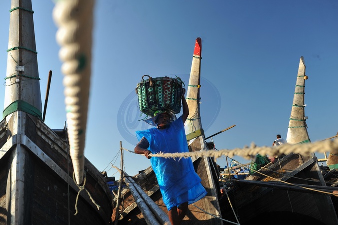 Chattogram, Bangladesh — At winter's first light, labourers in blue plastic aprons unload fresh catch from trawlers at Fisharighat, a key maritime hub, powering Bangladesh's fishing industry, climate-vulnerable coast, marine economy, food security sector, global seafood supply chain, aquaculture growth, and shrimp-export market., Credit:Md Rafayat Haque Khan / Avalon