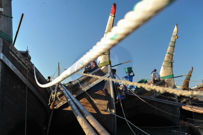 Chattogram, Bangladesh — At winter's first light, labourers in blue plastic aprons unload fresh catch from trawlers at Fisharighat, a key maritime hub, powering Bangladesh's fishing industry, climate-vulnerable coast, marine economy, food security sector, global seafood supply chain, aquaculture growth, and shrimp-export market., Credit:Md Rafayat Haque Khan / Avalon