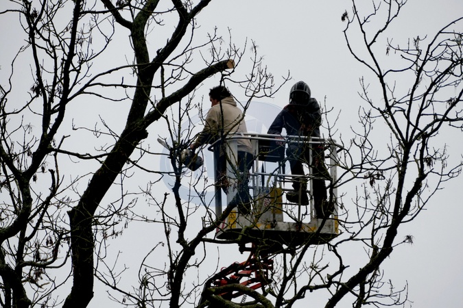 Tree fellers cut off the diseased branches. Country paths are being cleared and fallen ash tree logs are being used to create a new area for walkways and regrowth management after an outbreak of ash dieback in Clayfield Copse & Blackhouse Woods. Saplings are going to be planted to bring new life too old. Ash dieback disease was confirmed at Clayfield Copse at the start of the year, it is a popular local nature reserve in Reading. The fungal disease significantly weakens ash trees, making their branches and entire trunks brittle and prone to falling with little warning, posing a serious public safety risk., Credit:Geoffrey Swaine / Avalon