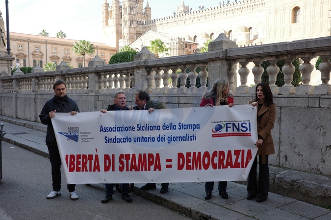 Protesters march through the city center during the national general strike called by the CGIL (Italian General Confederation of Labour) against the budget law. In the photo, some protesters hold a FNSI (National Federation of Labour) sign reading "Freedom of the press = democracy." Palermo, Italy 12 December 2025, Credit:Christian Bonaviri / Avalon