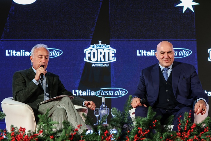 Atreju, demonstration of the Italian right, in the photo the commentator and journalist Marco Travaglio with the Minister of Defense Guido Crosetto. Italy 12 December 2025, Credit:Francesca Bolla / Avalon