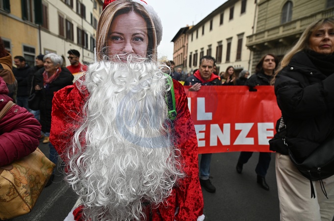 National general strike of the CGIL (Italian General Confederation of Labour). In the photo, a protester wears a mask with the face of Prime Minister Giorgia Meloni dressed as Santa Claus. Florence, Italy 12 December 2025, Credit:Aleandro Biagianti / Avalon