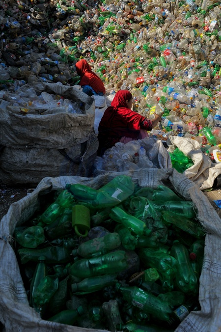 Chattogram, Bangladesh- Two Women sorts plastic bottles from a mountain of discarded waste at a recycling facility in Chattogram, Bangladesh. These materials are processed and exported to countries including Turkey, Dubai, and the USA—highlighting both the massive environmental burden of plastic pollution and the vital role recycling plays in the global circular economy., Credit:Md Rafayat Haque Khan / Avalon