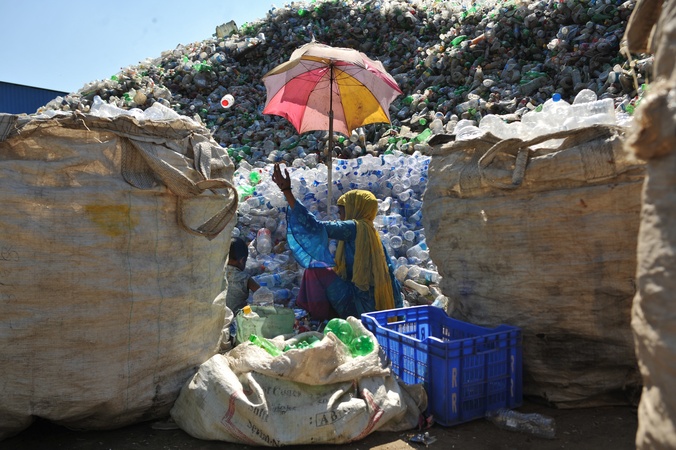 Chattogram, Bangladesh- A Woman sorts plastic bottles from a mountain of discarded waste at a recycling facility in Chattogram, Bangladesh. These materials are processed and exported to countries including Turkey, Dubai, and the USA—highlighting both the massive environmental burden of plastic pollution and the vital role recycling plays in the global circular economy., Credit:Md Rafayat Haque Khan / Avalon