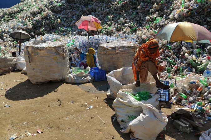 Chattogram, Bangladesh- Two Women sorts plastic bottles from a mountain of discarded waste at a recycling facility in Chattogram, Bangladesh. These materials are processed and exported to countries including Turkey, Dubai, and the USA—highlighting both the massive environmental burden of plastic pollution and the vital role recycling plays in the global circular economy., Credit:Md Rafayat Haque Khan / Avalon