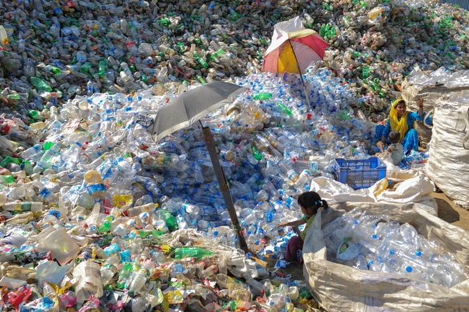 Chattogram, Bangladesh- A Woman sorts plastic bottles from a mountain of discarded waste at a recycling facility in Chattogram, Bangladesh. These materials are processed and exported to countries including Turkey, Dubai, and the USA—highlighting both the massive environmental burden of plastic pollution and the vital role recycling plays in the global circular economy., Credit:Md Rafayat Haque Khan / Avalon