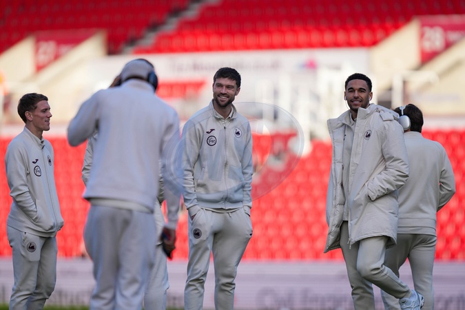 Swansea City players inspect the pitch during the Sky Bet Championship match Stoke City vs Swansea City at Bet365 Stadium, Stoke-on-Trent, United Kingdom, 13th December 2025, Credit:Maynard Manyowa/News Images / Avalon