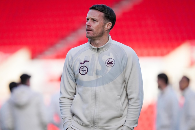 Swansea City players inspect the pitch during the Sky Bet Championship match Stoke City vs Swansea City at Bet365 Stadium, Stoke-on-Trent, United Kingdom, 13th December 2025, Credit:Maynard Manyowa/News Images / Avalon
