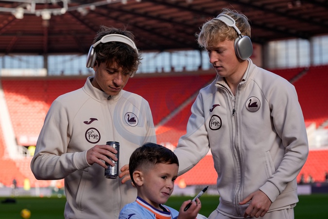 Gonçalo Franco of Swansea City and Melker Widell of Swansea City sign a ball for a fan wearing an Ethan Galbraith replica shirt during the Sky Bet Championship match Stoke City vs Swansea City at Bet365 Stadium, Stoke-on-Trent, United Kingdom, 13th December 2025, Credit:Maynard Manyowa/News Images / Avalon