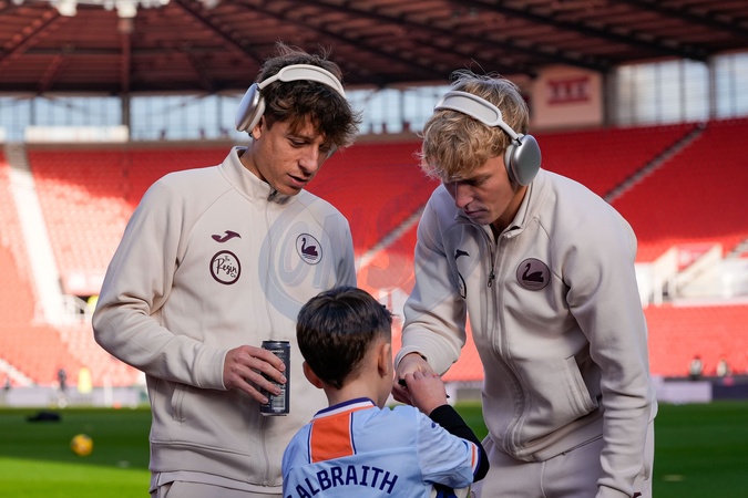 Gonçalo Franco of Swansea City and Melker Widell of Swansea City sign a ball for a fan wearing an Ethan Galbraith replica shirt during the Sky Bet Championship match Stoke City vs Swansea City at Bet365 Stadium, Stoke-on-Trent, United Kingdom, 13th December 2025, Credit:Maynard Manyowa/News Images / Avalon