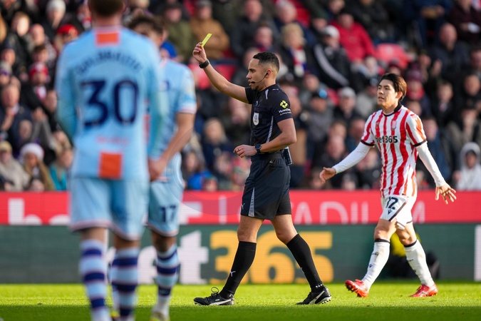 Referee Ruebyn Ricardo shows a yellow card to Liam Cullen of Swansea City during the Sky Bet Championship match Stoke City vs Swansea City at Bet365 Stadium, Stoke-on-Trent, United Kingdom, 13th December 2025, Credit:Maynard Manyowa/News Images / Avalon