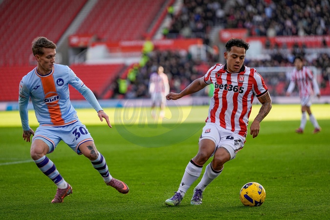 Ben Pearson of Stoke City dribbles the ball while being marked by Ethan Galbraith of Swansea City during the Sky Bet Championship match Stoke City vs Swansea City at Bet365 Stadium, Stoke-on-Trent, United Kingdom, 13th December 2025, Credit:Maynard Manyowa/News Images / Avalon