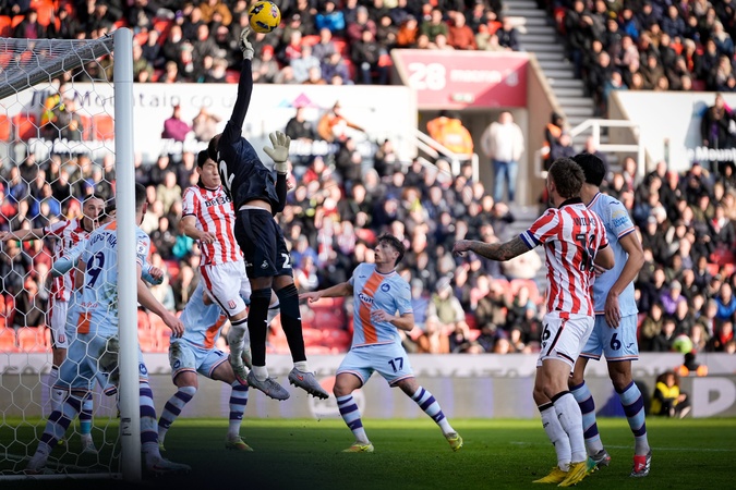 Lawrence Vigouroux of Swansea City leaps to make a save during the Sky Bet Championship match Stoke City vs Swansea City at Bet365 Stadium, Stoke-on-Trent, United Kingdom, 13th December 2025, Credit:Maynard Manyowa/News Images / Avalon