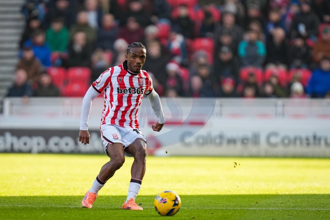 Eric Bocat of Stoke City runs with the ball during the Sky Bet Championship match Stoke City vs Swansea City at Bet365 Stadium, Stoke-on-Trent, United Kingdom, 13th December 2025, Credit:Maynard Manyowa/News Images / Avalon