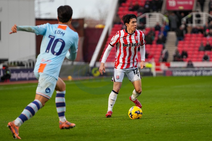 Tatsuki Seko of Stoke City with the ball while Eom Ji-Sung of Swansea City runs in to challenge during the Sky Bet Championship match Stoke City vs Swansea City at Bet365 Stadium, Stoke-on-Trent, United Kingdom, 13th December 2025, Credit:Maynard Manyowa/News Images / Avalon