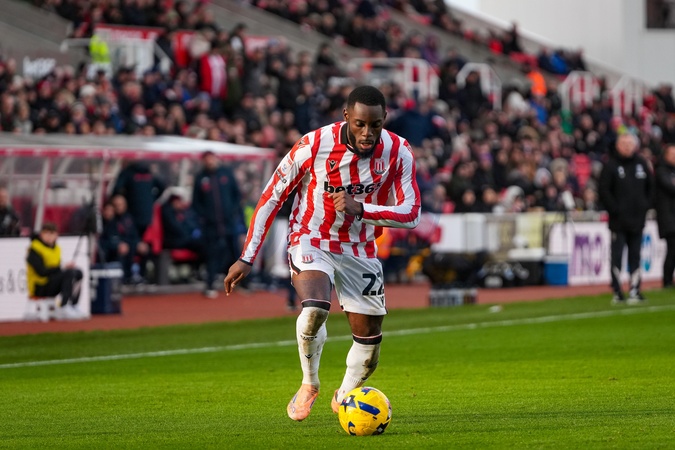 Junior Tchamadeu of Stoke City controls the ball during the Sky Bet Championship match Stoke City vs Swansea City at Bet365 Stadium, Stoke-on-Trent, United Kingdom, 13th December 2025, Credit:Maynard Manyowa/News Images / Avalon