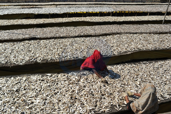 13 December 2025 Chattogram, Bangladesh- Women process fish at an open drying yard in Chattogram, Bangladesh. The fish are cleaned, salted, and sun-dried on bamboo platforms for four to five days, depending on weather conditions. Dry fish processing requires consistent heat and remains a vital food source in Bangladesh, accounting for the fourth-largest share of fish consumption and providing an affordable protein across all income levels. The dried fish are distributed for domestic use and export., Credit:Md Rafayat Haque Khan / Avalon
