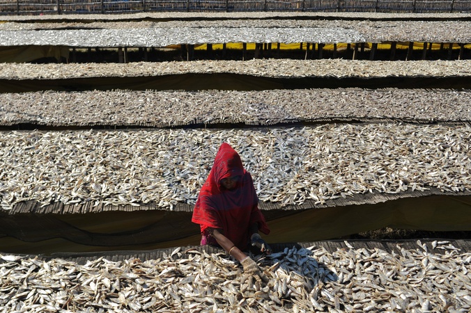 13 December 2025 Chattogram, Bangladesh- Women process fish at an open drying yard in Chattogram, Bangladesh. The fish are cleaned, salted, and sun-dried on bamboo platforms for four to five days, depending on weather conditions. Dry fish processing requires consistent heat and remains a vital food source in Bangladesh, accounting for the fourth-largest share of fish consumption and providing an affordable protein across all income levels. The dried fish are distributed for domestic use and export., Credit:Md Rafayat Haque Khan / Avalon